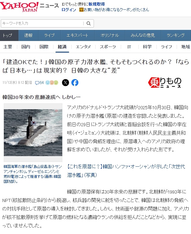 日 언론 "한국은 핵잠수함을 건조할 능력이 있나? 한일의 큰 차이" 일본반응